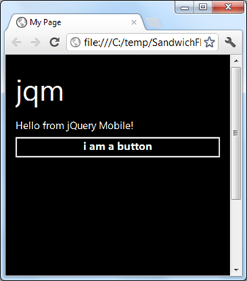 Considering that jQM is all about styling, why do we have JavaScript files as well as CSS files in our project? If you look at the source of the rendered page, you will see why. The simple button in our source HTML is now the following: