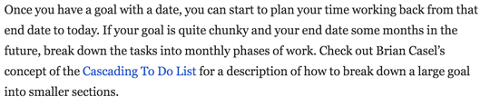 Because our seeing similarly coloured elements as being part of a group (see the Gestalt Principles, for more, the Head of UX Practice at Scott Logic Graham Odds’ presentation on data visualisation), we see the blue text ‘Cascading To Do List’ as inherently different from the surrounding text. This difference draws our attention, signifying that there may be something functionally different about it. If we move our cursor over this blue text, we trigger more actions: