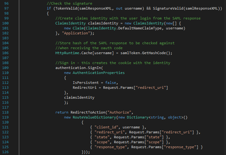The Client app uses the state parameter to access the user’s session state (ClientController.cs line 86) and issues a POST back to the Authorisation server in order to exchange the authorisation code for an OAuth access token (ClientController.cs line 99). The request includes the username and SAML hash to be compared as means of authentication (ClientController.cs line 90).