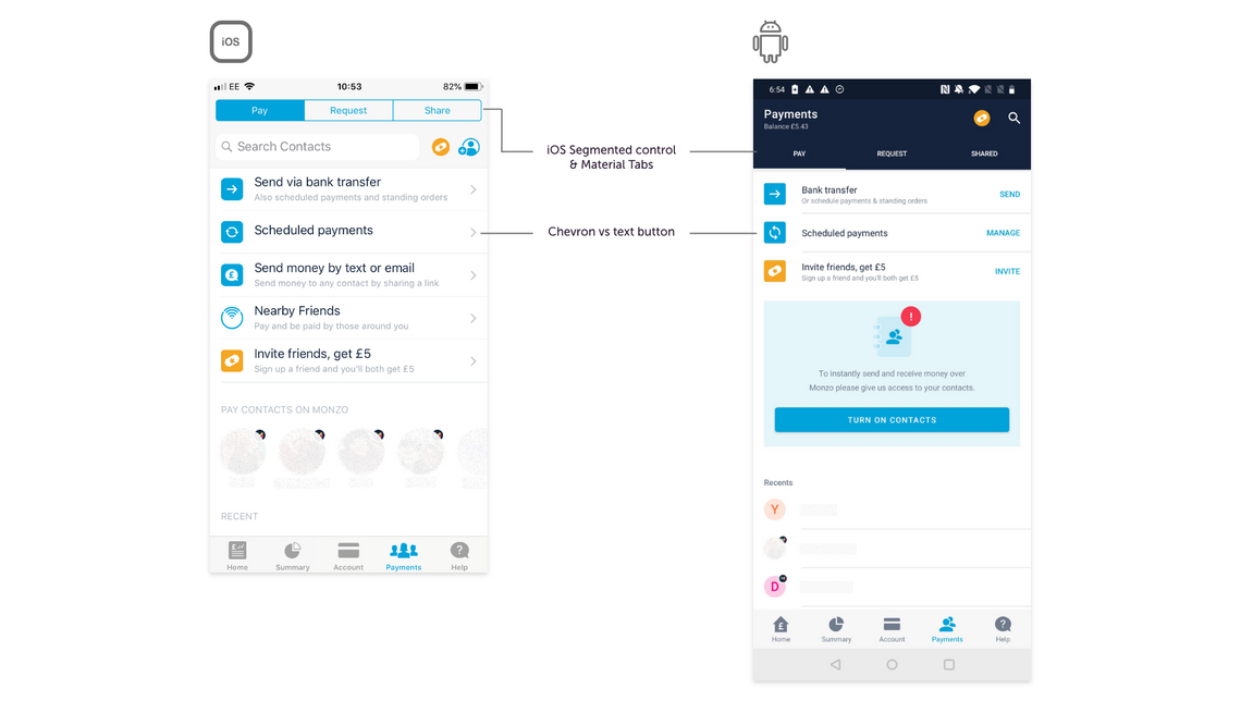 In general, Monzo’s approach to cross-platform design appears to be based on creating a similar look and feel across both their iOS and Android apps, while still making good use of native components. This gives the apps a platform familiarity, but also should increase the efficiency of their development cycles.