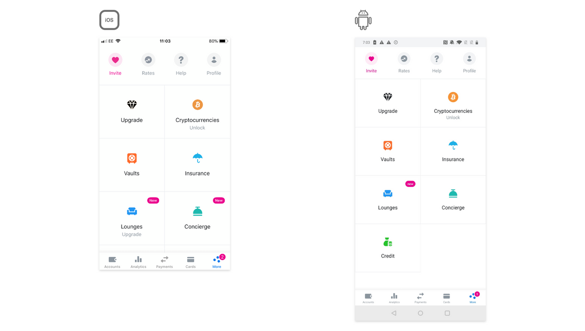 Revolut have also use some custom navigation which doesn’t necessarily relate closely to either of the native guidelines standard components. For example, below in their ‘More’ section, they have a top tab bar, grid-style navigation and a bottom bar in one screen. This may add an additional creative edge, but the usability of the interface should be carefully tested.