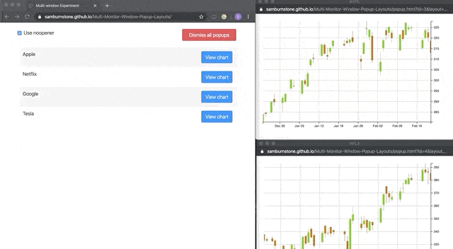 After enabling the flag, Chrome is able to move our pop-up windows across monitors (note that you’ll need to be using a Chromium browser >= version 80 for the new window placement functionality to work).