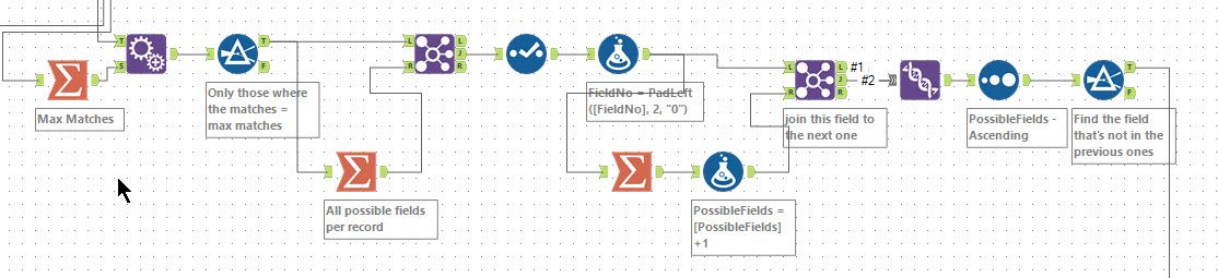 For each row, a concatenated string of all the possible column numbers is created and assigned to a value of the number of possible fields plus 1. By joining this to the ruleset, it is possible to work out which column has not been used and produce the required column mapping.