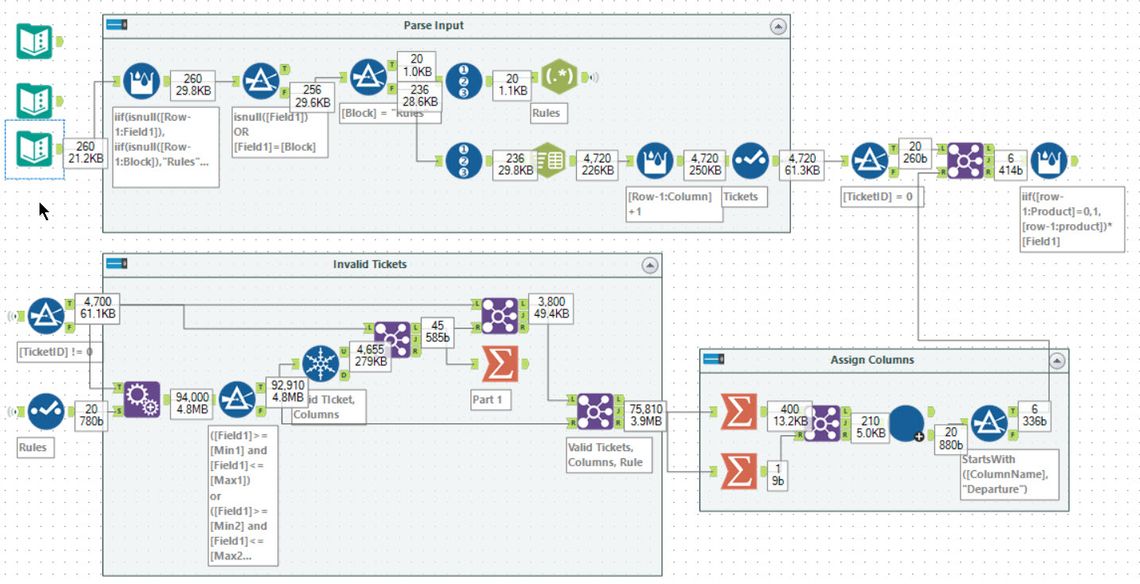 Having parsed the input, the next task is to filter the tickets fields to see which rules are valid for which fields. I choose to use an append fields tool to add every possible rule to every ticket and column. You can then join this to the set of tickets to produce the tickets where no field passed any rule (the unique tool in my workflow is not needed - bad tool golf!).