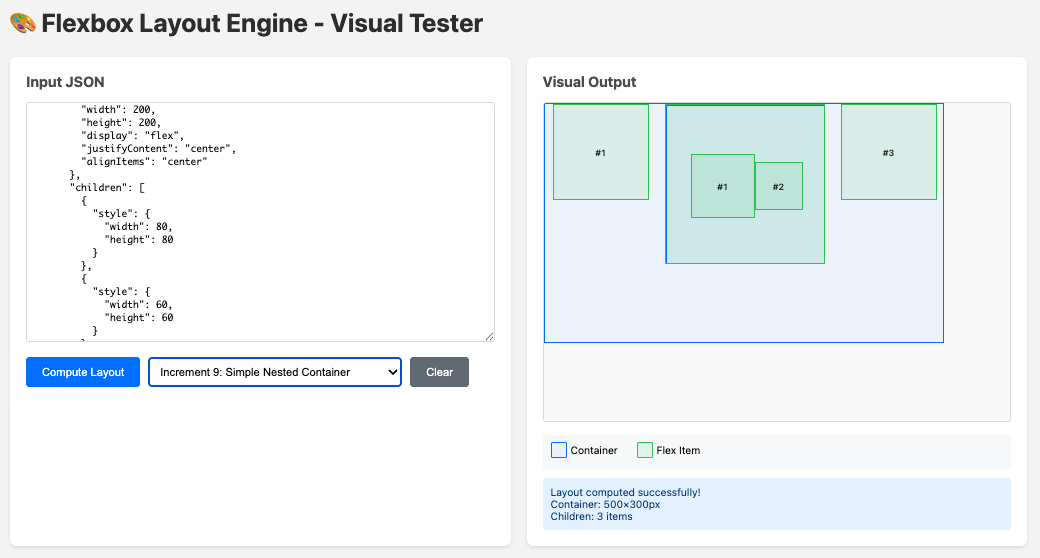 By the end of the final increment I was around three hours into the whole experiment. The layout algorithm was around ~800 lines, with a suite of ~350 tests. An impressive result.
